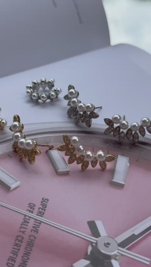 Brinco com perolas sinteticas, pedras em zirconias cravejadas e petalas sinteticas.